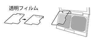 透明フィルムを取り出した後、▼部分のミシン目を山折りにして、レフィルの上に置いてケースとフタの間に差し込み固定させます。