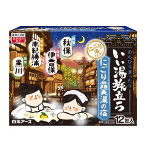 4種類の風情漂う香りと湯色で、にごり湯の温泉気分が楽しめます。 温泉成分が温浴効果を高めて血行を促進し、疲労回復や肩のこり等に効果があります。 保湿成分(コメヌカエキス、ショウガエキス)配合で、しっとりした湯上り感です。 4種類の風情漂う香りと湯色で、にごり湯の温泉気分を楽しめます。 温泉成分(炭酸水素ナトリウム、硫酸ナトリウム)が温浴効果を高めて血行を促進し、疲労回復や肩のこり等に効果があります。 保湿成分(コメヌカエキス、ショウガエキス)配合で、しっとりした湯上がり感です。 宮城/秋保 柔らかく優美な白檀の香り〈乳白色の湯〉 群馬/伊香保 優雅で清らかな梔子の香り〈乳桃色の湯〉 和歌山/南紀勝浦 甘くほろ苦い八朔の香り〈乳黄色の湯〉 熊本/黒川 懐かしく穏やかない草の香り〈乳緑色の湯〉 ※本品は、温泉の湯を再現したものではありません。 <効能> 疲労回復、肩のこり、腰痛、リウマチ、冷え症、しもやけ、にきび、痔、ひび、あかぎれ、荒れ性、あせも、しっしん、神経痛 <使用方法> 家庭用浴槽にお湯(約200L)を張ってから、本品1包(25g)を入れ、よくかき混ぜて入浴してください。 本品と他の入浴剤は併用しないでください。 小児の手の届かない所に保管してください。 入浴以外の用途には使用しないでください。 高温多湿の場所に保管しないでください。 アルミパック開封後はすぐにお使いください。 <使用上の注意> <身体について> 皮フあるいは体質に異常がある場合は医師に相談してご使用ください。 使用中や使用後、皮フに発疹、発赤、かゆみ、刺激感等の異常が現れた場合、使用を中止し、医師にご相談ください。 本品は食べられません。万一飲み込んだ場合は、水を飲ませる等の処置を行ってください。 <浴槽について> 浴槽・風呂釜をいためるイオウは入っておりません。 浴槽の汚れは早めに浴室用洗剤で落としてください。時間がたつと落ちにくくなり、入浴剤の色素が付着して色がつくこともあります。 <残り湯について> 残り湯は洗濯に使えますが、すすぎは清水をお使いください。 着色するおそれがあるので、次の場合は使わないでください。 (柔軟仕上げ剤との併用、つけおき、おろしたての衣類) 植物への水やりに使わないでください。 <にごり湯成分についての注意> 全自動給湯器、24時間風呂の場合、機種によってはご使用になれない場合があります。 お使いの機種の説明書を確認の上ご使用ください。 木製の風呂の場合、白濁成分がとれにくい場合がありますのでご使用をお避けください。 使用後は風呂釜内部や循環孔のフィルター等をよく洗い流してください。 (風呂釜内部の湯あか等に白濁成分が一部付き、循環孔から浴槽内へ出ることがあります。) 浴槽のまわりや底に残った白濁成分は、よく洗い流してください。 |