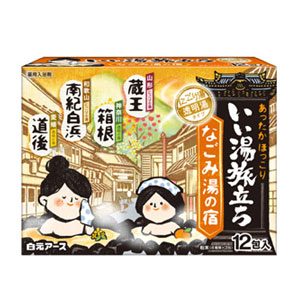 4種類の風情漂う香りと湯色で、にごり湯と透明湯の温泉気分を楽しめます。 温泉成分が温浴効果を高めて血行を促進し、疲労回復や肩のこり等に効果があります。 保湿成分配合でしっとりとした湯上り感です。 4種類の風情漂う香りと湯色で、温泉気分を楽しめます。 温泉成分(炭酸水素ナトリウム、硫酸ナトリウム)が温浴効果を高めて血行を促進し、疲労回復や肩のこり等に効果があります。 山形/乳紅色の湯/にごり湯 蔵王:たわわに実る林檎の香り 神奈川/濃緑色の湯/透明湯 箱根:山裾を包む森林の香り 和歌山/乳蜜柑色の湯/にごり湯 南紀白浜:心和む蜜柑の香り 愛媛/山吹色の湯/透明湯 道後:可憐に咲き誇る金木犀の香り ※本品は、温泉の湯を再現したものではありません。 にごり湯:保湿成分(チンピエキス、ハトムギエキス)配合で、しっとりした湯上がり感です。 透 明 湯:保湿成分(チンピエキス、トウキエキス)配合で、なめらかな湯上がり感です <効能> 疲労回復、肩のこり、腰痛、リウマチ、冷え症、しもやけ、にきび、痔、ひび、あかぎれ、荒れ性、あせも、しっしん、神経痛 <使用方法> 家庭用浴槽にお湯(約200L)を張ってから、本品1包(25g)を入れ、よくかき混ぜて入浴してください。 本品と他の入浴剤は併用しないでください。 小児の手の届かない所に保管してください。 入浴以外の用途には使用しないでください。 高温多湿の場所に保管しないでください。 アルミパック開封後はすぐにお使いください。 <使用上の注意> <身体について> 皮フあるいは体質に異常がある場合は医師に相談してご使用ください。 使用中や使用後、皮フに発疹、発赤、かゆみ、刺激感等の異常が現れた場合、使用を中止し、医師にご相談ください。 本品は食べられません。万一飲み込んだ場合は、水を飲ませる等の処置を行ってください。 <浴槽について> 浴槽・風呂釜をいためるイオウは入っておりません。 浴槽の汚れは早めに浴室用洗剤で落としてください。時間がたつと落ちにくくなり、入浴剤の色素が付着して色がつくこともあります。 <残り湯について> 残り湯は洗濯に使えますが、すすぎは清水をお使いください。 着色するおそれがあるので、次の場合は使わないでください。 (柔軟仕上げ剤との併用、つけおき、おろしたての衣類) 植物への水やりに使わないでください。 <にごり湯成分についての注意> 全自動給湯器、24時間風呂の場合、機種によってはご使用になれない場合があります。 お使いの機種の説明書を確認の上ご使用ください。 木製の風呂の場合、白濁成分がとれにくい場合がありますのでご使用をお避けください。 使用後は風呂釜内部や循環孔のフィルター等をよく洗い流してください。 (風呂釜内部の湯あか等に白濁成分が一部付き、循環孔から浴槽内へ出ることがあります。) 浴槽のまわりや底に残った白濁成分は、よく洗い流してください。 |